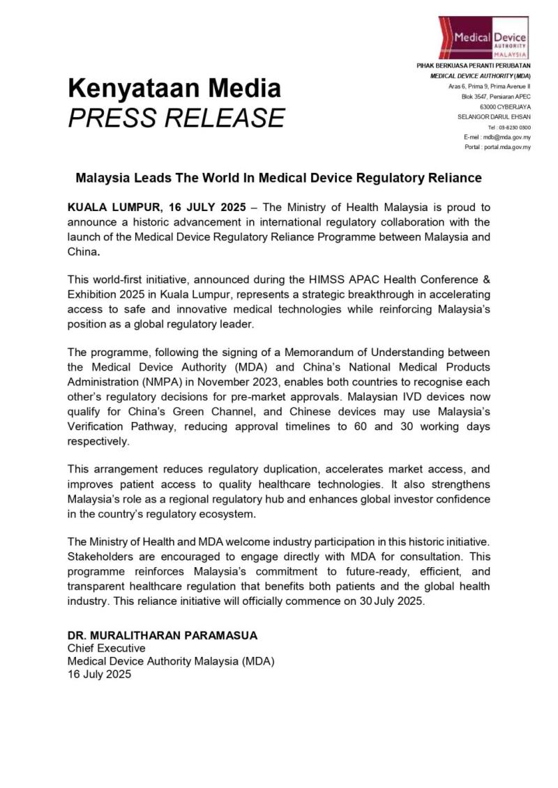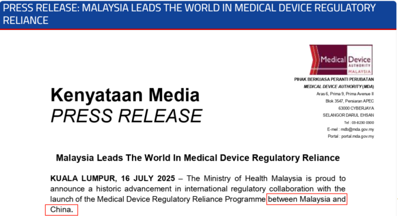 近日,馬來西亞MDA推出了馬來西亞與中國(guó)之間的醫(yī)療器械監(jiān)管互信計(jì)劃,該計(jì)劃提到,中國(guó)醫(yī)療器械產(chǎn)品憑NMPA認(rèn)證可通過馬來西亞“驗(yàn)證通道”(Verification Pathway)30個(gè)工作日極速獲批,而馬來西亞IVD產(chǎn)品也可經(jīng)中國(guó)“綠色通道”(Green Channel)60個(gè)工作日準(zhǔn)入中國(guó)市場(chǎng),計(jì)劃將于2025年7月30日正式啟動(dòng)。