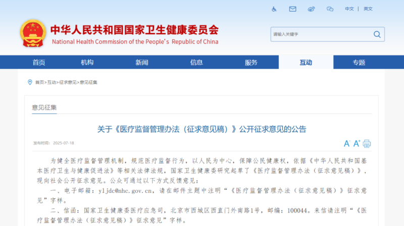 近日,國(guó)家衛(wèi)健委發(fā)布《醫(yī)療監(jiān)督管理辦法(征求意見(jiàn)稿)》(以下簡(jiǎn)稱《辦法》),并向社會(huì)公開(kāi)征求意見(jiàn)。