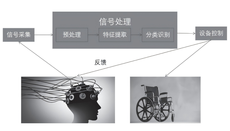 20世紀(jì)70年代初,美國加州大學(xué)洛杉磯分校的計(jì)算機(jī)科學(xué)教授雅克·維達(dá)爾(Jacques Vidal)首次提出了“腦機(jī)接口”這一名詞 。經(jīng)過數(shù)十年的發(fā)展,腦機(jī)接口已逐漸成為電腦通信技術(shù)的新種類之一。其基本原理是,人們使用腦機(jī)接口收集腦電信號(hào),利用腦電信號(hào)控制電腦程序。目前,腦機(jī)接口技術(shù)已經(jīng)取得了諸多突破并且在多個(gè)領(lǐng)域得到應(yīng)用和推廣,尤其是在康復(fù)醫(yī)學(xué)領(lǐng)域。有研究表明,腦機(jī)接口可通過患者的運(yùn)動(dòng)想象來刺激大腦皮層相關(guān)區(qū)域,然后利用收集到的腦電信號(hào)來啟動(dòng)功能性電刺激,并以此來刺激受損的肌肉神經(jīng),患者可以利用此電刺激主動(dòng)參與發(fā)力,以達(dá)到改善運(yùn)動(dòng)功能的效果。腦機(jī)接口的工作原理可以分為信號(hào)采集、信號(hào)處理、控制設(shè)備和反饋 4 個(gè)部分,具體如下。