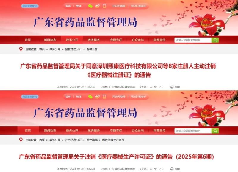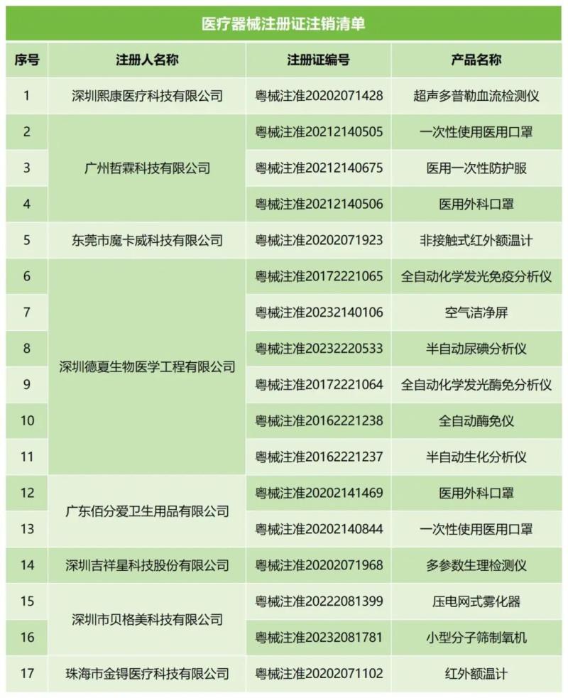 近日,廣東省藥監(jiān)局發(fā)布兩則注銷(xiāo)通告,通告顯示,根據(jù)企業(yè)申請(qǐng),該局已注銷(xiāo)深圳熙康醫(yī)療科技有限公司、深圳德夏生物醫(yī)學(xué)工程有限公司等8家注冊(cè)人持有的17張《醫(yī)療器械注冊(cè)證》,同時(shí)注銷(xiāo)了廣東佰分愛(ài)衛(wèi)生用品有限公司、深圳吉祥星科技股份有限公司等9家企業(yè)的《醫(yī)療器械生產(chǎn)許可證》,具體明細(xì)如下:
