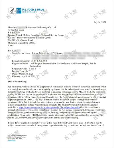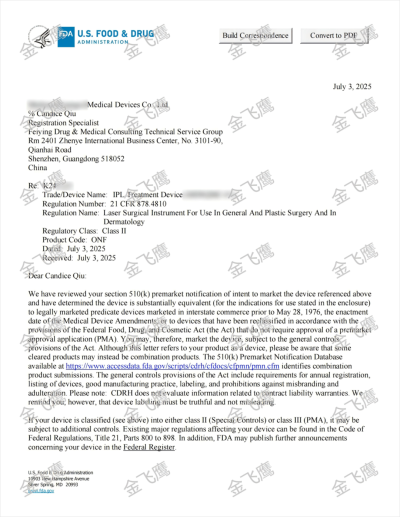 關(guān)注我們的朋友想必已經(jīng)注意到,我們?cè)诿撁珒x510(k)注冊(cè)領(lǐng)域的成就同樣極為亮眼。由于成功案例實(shí)在太多,很多新取得的K號(hào)甚至都來(lái)不及一一宣傳。值此機(jī)會(huì),我們特別精選兩張今年7月新出的K號(hào)與大家分享,更多脫毛儀510(k)成功案例,歡迎點(diǎn)擊右側(cè)鏈接查看?IPL脫毛儀510(k)。