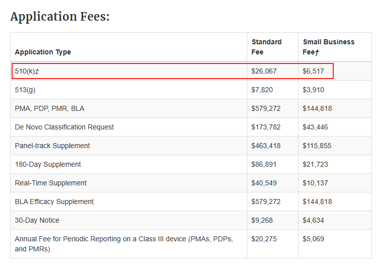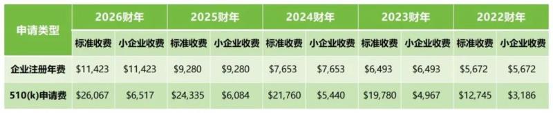 具體來說,企業(yè)注冊年費漲至$11423,相比2025財年的$9280上漲了$2143,漲幅23.1%;相比而言,510(k)申請費的漲幅則要稍小一些:其中510(k)申請標(biāo)準(zhǔn)收費漲至$26067,小企業(yè)的510(k)申請費則為6517美元,漲幅均為7.1%。
