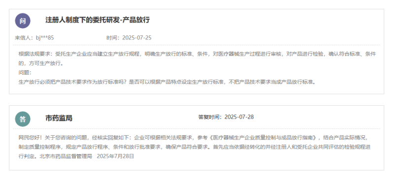 根據(jù)北京市藥監(jiān)局的答復,企業(yè)可根據(jù)相關法規(guī)要求,參考《醫(yī)療器械生產企業(yè)質量控制與成品放行指南》,結合產品實際情況,制定質量控制程序,規(guī)定產品放行程序、條件和放行批準要求,確保產品符合要求。首先應當依據(jù)經轉化的并經注冊人和受托企業(yè)共同評估的檢驗規(guī)程進行判定。