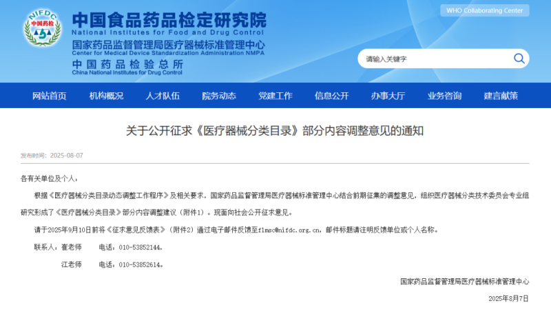 8月7日,國(guó)家藥品監(jiān)督管理局醫(yī)療器械標(biāo)準(zhǔn)管理中心發(fā)布《醫(yī)療器械分類目錄》部分內(nèi)容調(diào)整建議,并向社會(huì)公開征求意見。