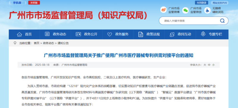 8月18日,廣州市市場監(jiān)督管理局發(fā)布《關于推廣使用廣州市醫(yī)療器械專利供需對接平臺的通知》(以下簡稱《通知》),《通知》提到,該局依托新型生物材料與高端醫(yī)療器械廣東研究院(以下簡稱“高端院”)“智械云”數(shù)據(jù)平臺建設“廣州市醫(yī)療器械專利供需對接平臺”(以下簡稱“供需平臺”),并于4月11日同步上線微信小程序和PC端。現(xiàn)就平臺推廣使用有關事項通知如下: