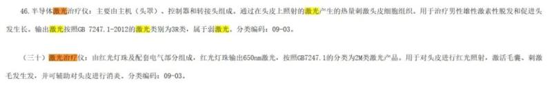 激光生發(fā)儀,主要通過在頭皮上照射的激光產(chǎn)生的熱量刺激頭皮細(xì)胞組織,用于刺激毛發(fā)生長,一般用的是2M類或3R類激光。國家藥監(jiān)局醫(yī)療器械標(biāo)準(zhǔn)管理中心在《2018年醫(yī)療器械產(chǎn)品分類界定結(jié)果匯總》及《2023年第三次醫(yī)療器械產(chǎn)品分類界定結(jié)果匯總》中,分別對(duì)此類產(chǎn)品的預(yù)期用途及分類進(jìn)行明確:作為第二類醫(yī)療器械管理,分類編碼09-03。產(chǎn)品的臨床評(píng)價(jià)方式為同品種對(duì)比。