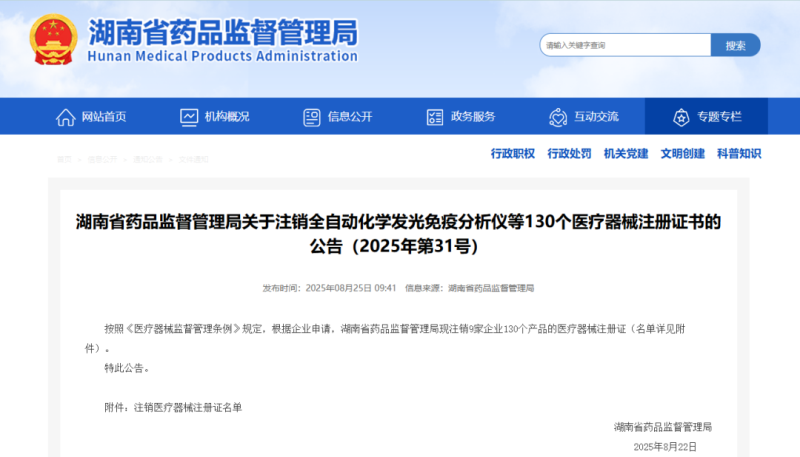 8月25日,湖南省藥監(jiān)局發(fā)布一則醫(yī)療器械注冊證注銷公告,公告顯示,該局已依法注銷湖南明德醫(yī)療器械有限公司、湖南雷杜生物技術(shù)有限公司、湖南宜樂芯康生物科技有限公司、長沙市鵬瑞生物科技有限公司等9家企業(yè)共計130個產(chǎn)品的醫(yī)療器械注冊證,以IVD產(chǎn)品居多,其中湖南明德醫(yī)療器械有限公司這一家企業(yè)共注銷了78款產(chǎn)品(含體外診斷設(shè)備及體外診斷試劑),其他企業(yè)注銷的產(chǎn)品包括醫(yī)用紅外耳溫計、特定電磁波治療器、掌上彩色多普勒超聲顯像儀等,具體明細(xì)如下: