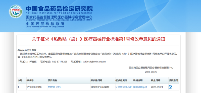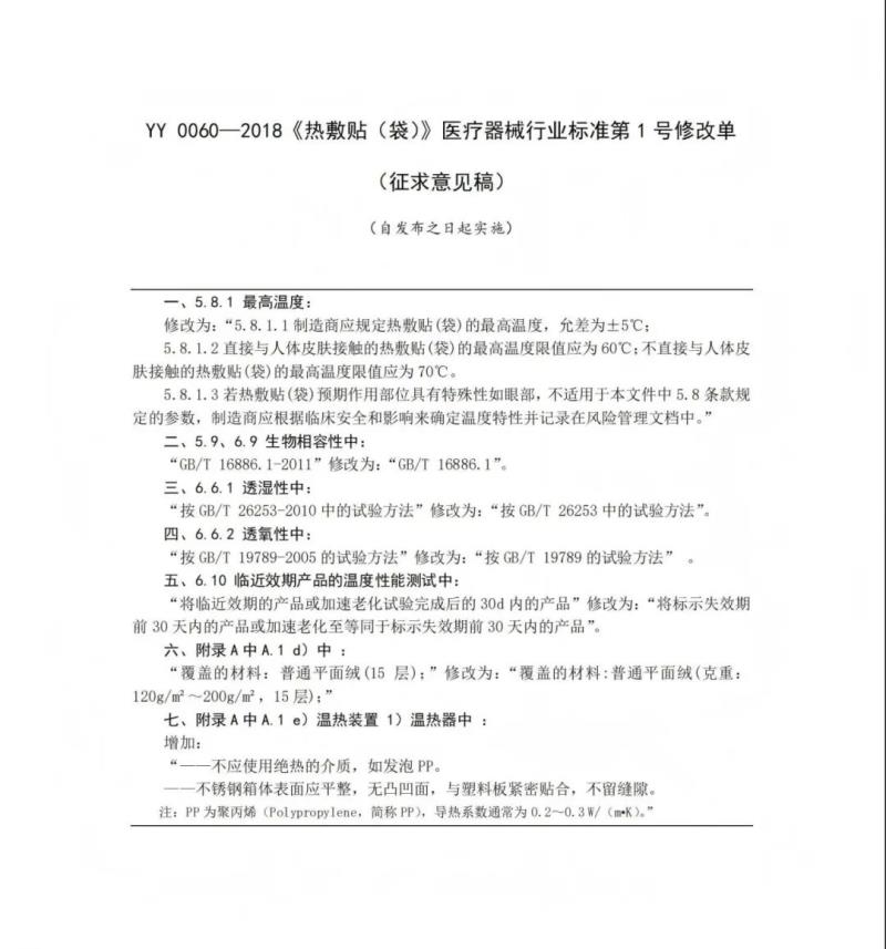 近日,國家藥監(jiān)局醫(yī)療器械標(biāo)管中心發(fā)布YY 0060-2018《熱敷貼(袋)》醫(yī)療器械行業(yè)標(biāo)準(zhǔn)第1號修改單,并向社會公開征求意見。
